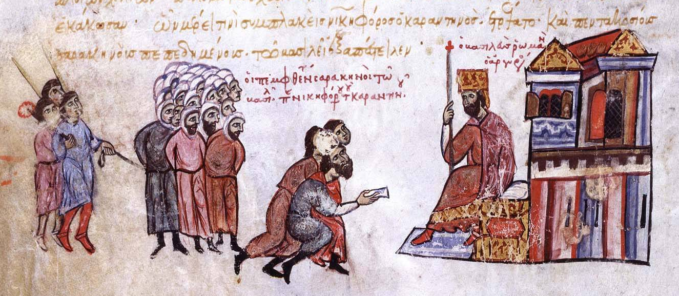 Previous Image Next Image Arab_captives_are_brought_before_Emperor_Romanos_III Arab captives before Romanos III, Madrid Skylitzes