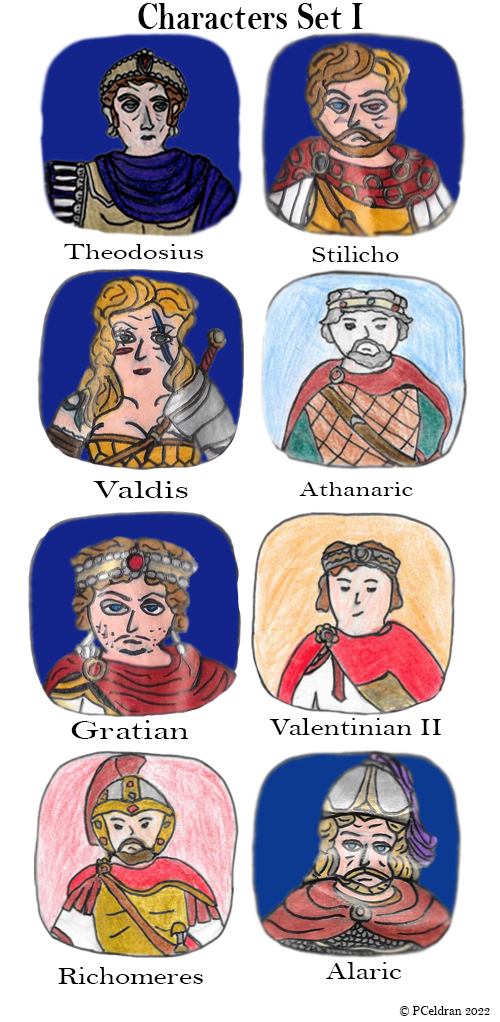 Story characters set1- Theodosius, Stilicho, Valdis, Athanaric, Gratian, Valentinian II, Richomeres, Alaric